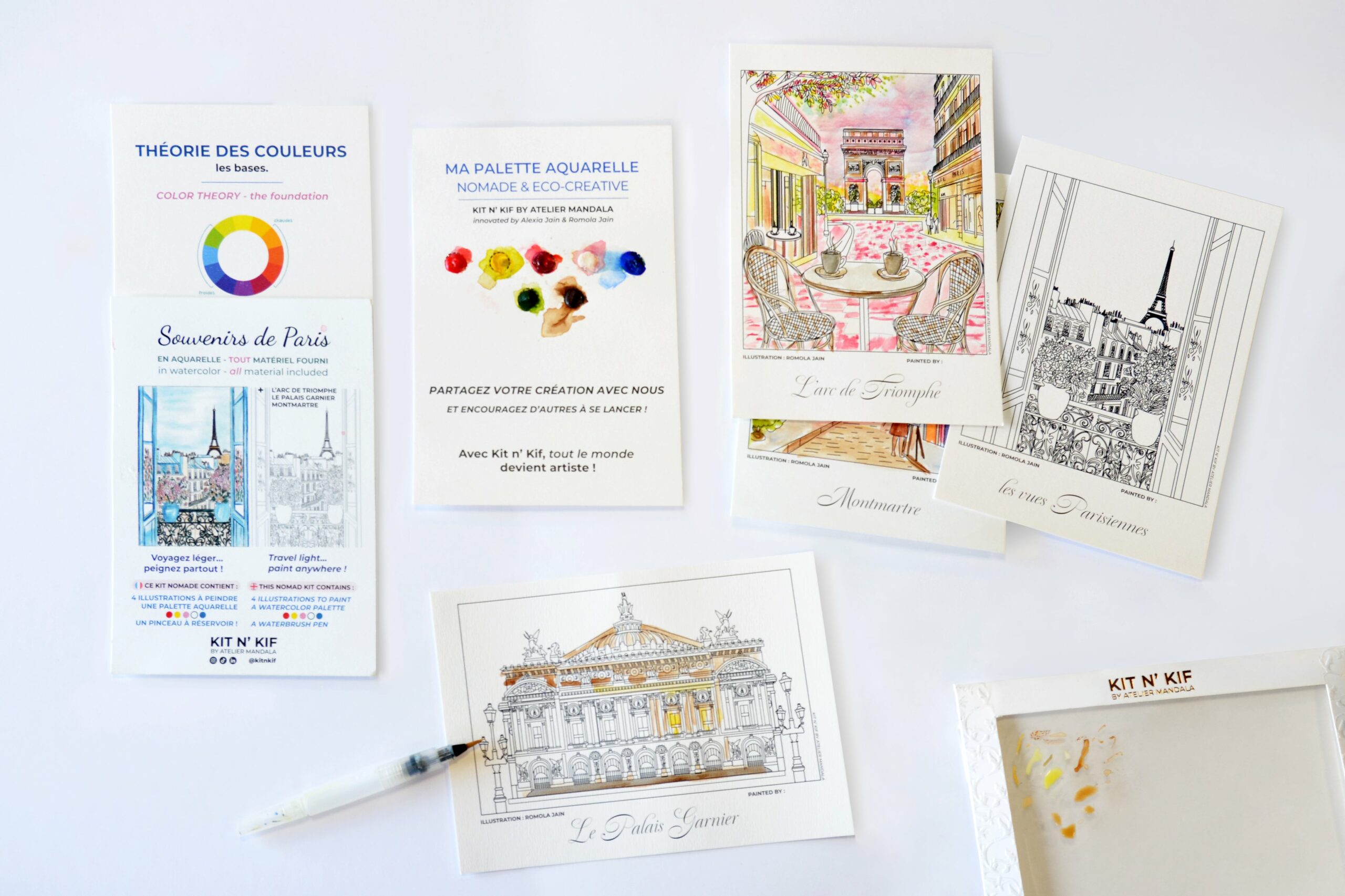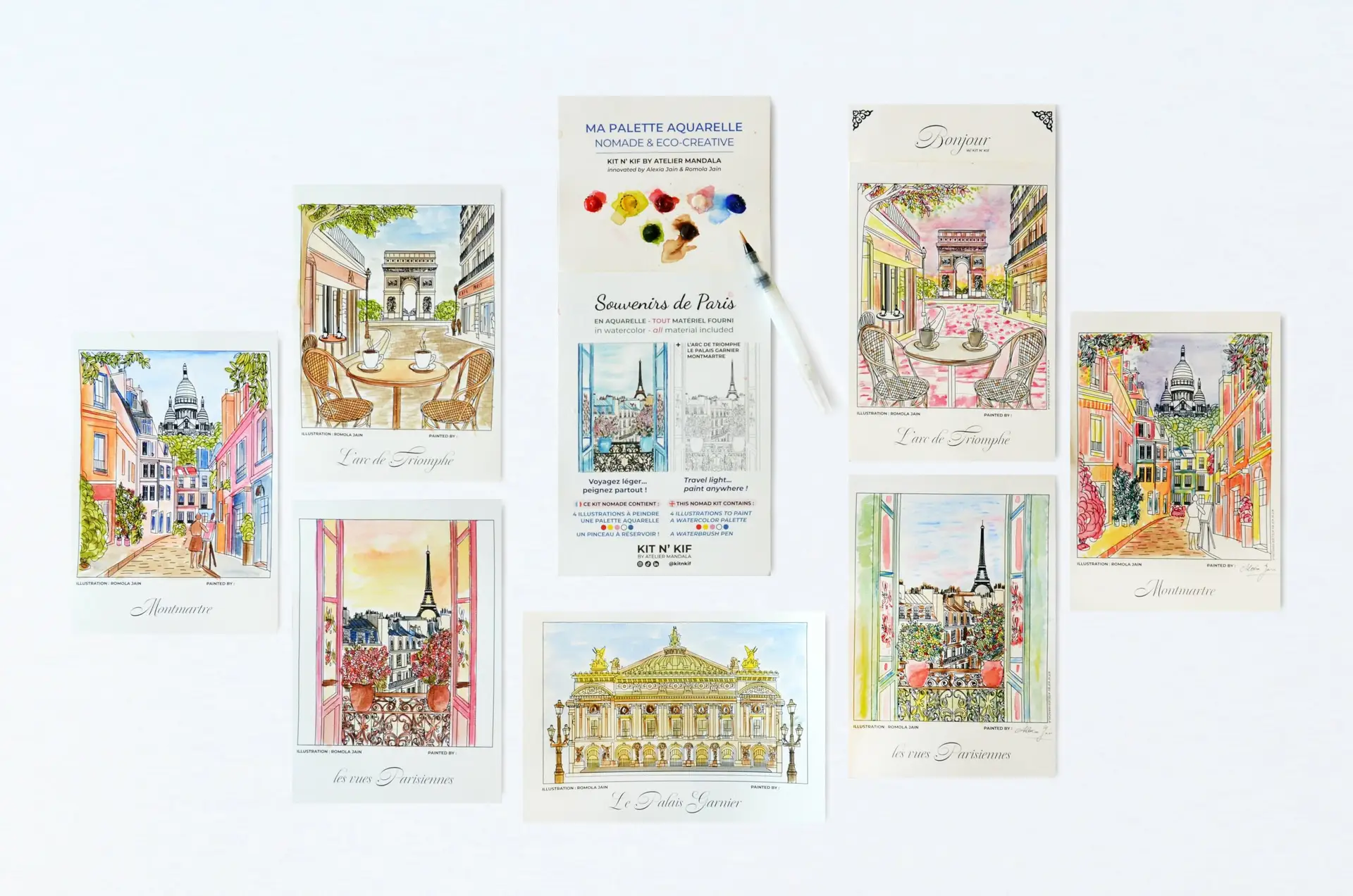 Kit Aquarelle Nomade – Souvenir de Paris : 4 illustrations à peindre (Montmartre, Arc de Triomphe, Tour Eiffel, Palais Garnier)